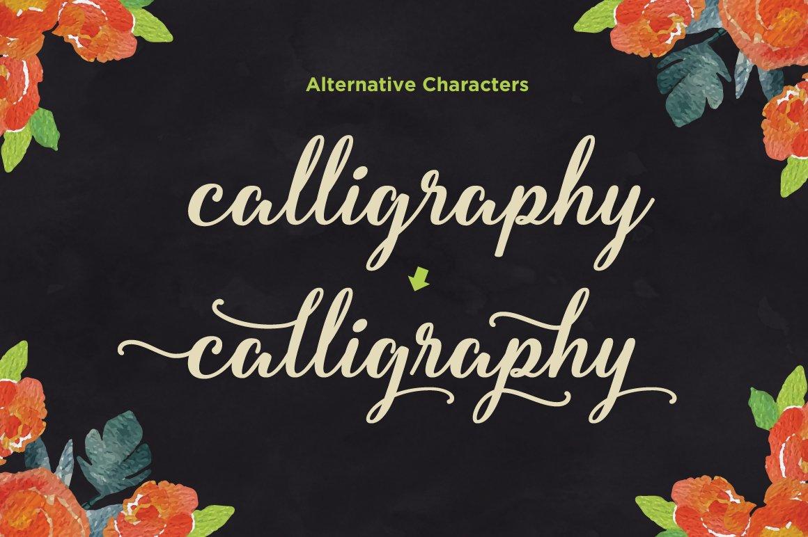 Fadilla font comes with a complete set of standard characters, eastern diacritic symbols, 338 glyphs in total, and 150 alternative characters as OpenType features to play with. The alternative characters were divided into several OpenType features such as Ligature, Contextual Alternates, and Stylistic Sets. You can create an attractive message by using the alternate characters in your design.