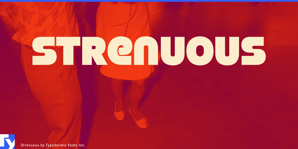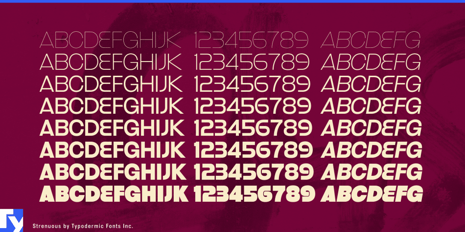Strenuous is a 1970’s-style unicase headliner. It’s available in 8 weights and italics. Some letters have alternate versions in the uppercase/lowercase positions.